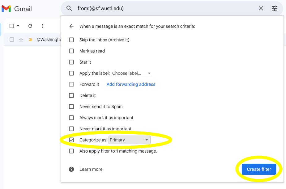 You can add @sf.wustl.edu to your Gmail whitelist and primary inbox at the same time by checking both the Never send it to Spam and Categorize as: Primary options