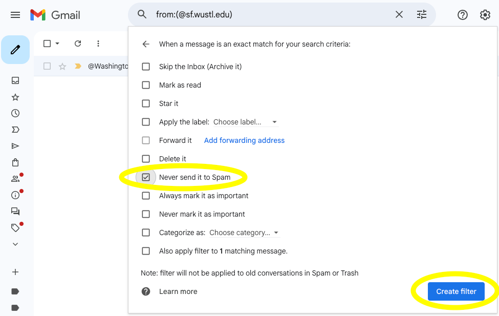 Step 2: Add WashU Advancement email to From field (@sf.wustl.edu), then click Create Filter.